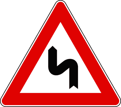 Il segnale raffigurato preannuncia una doppia curva pericolosa, la prima a sinistra