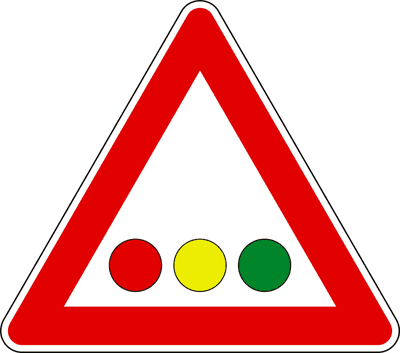 Il segnale raffigurato preannuncia un impianto semaforico con disposizione delle luci in orizzontale