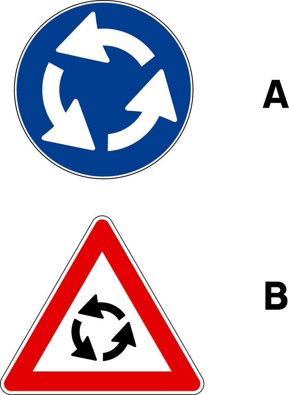 Il segnale di figura (A) su strade extraurbane è preceduto dal segnale di pericolo di CIRCOLAZIONE ROTATORIA in figura (B)