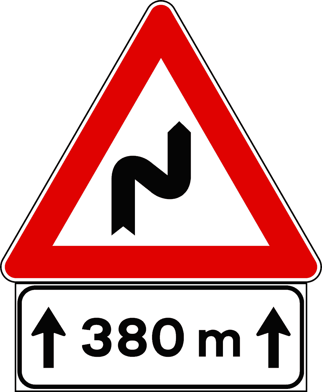 Il segnale raffigurato indica la lunghezza di un tratto stradale con curve pericolose in successione