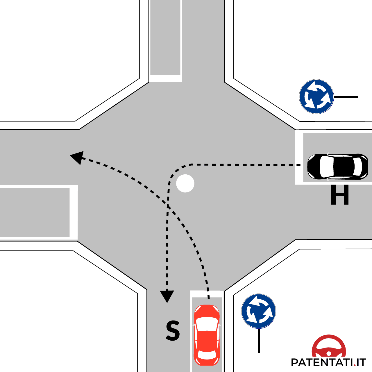 In una carreggiata a 8 di circolazione per svoltare a sinistra bisogna girare intorno al centro dell'incrocio come il veicolo H in figura, se c'è il segnale di rotatoria