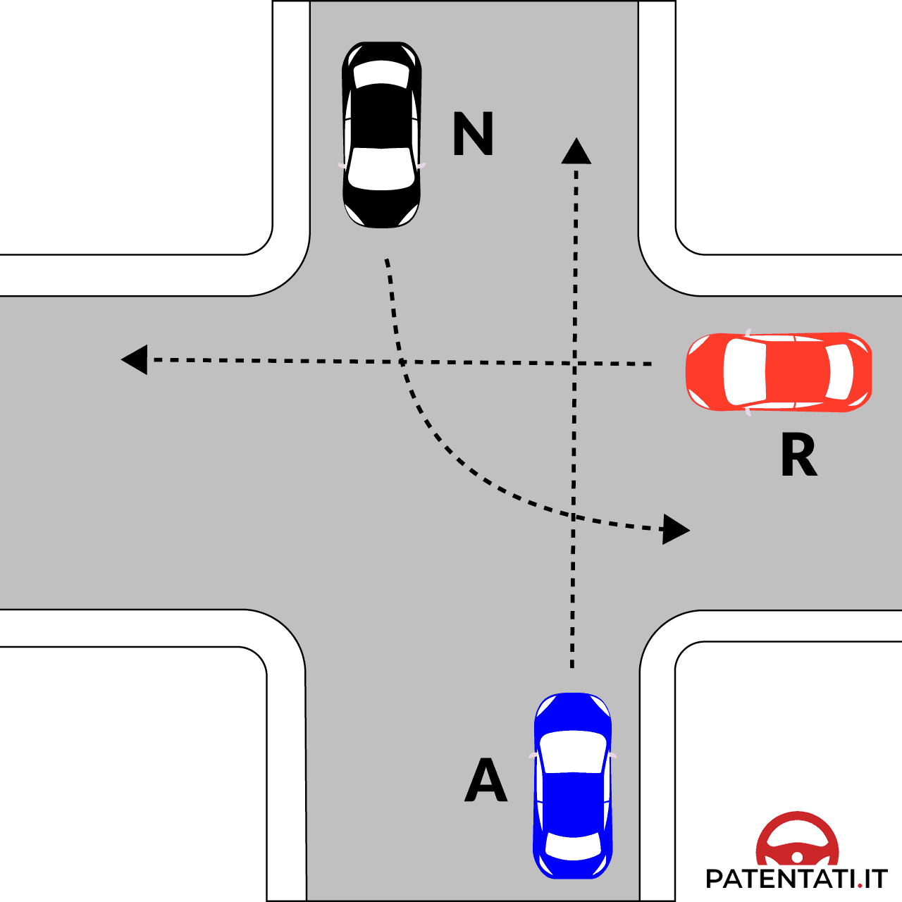 Nell'incrocio rappresentato nella figura il conducente del veicolo N  conclude  per ultimo l'attraversamento dell'incrocio