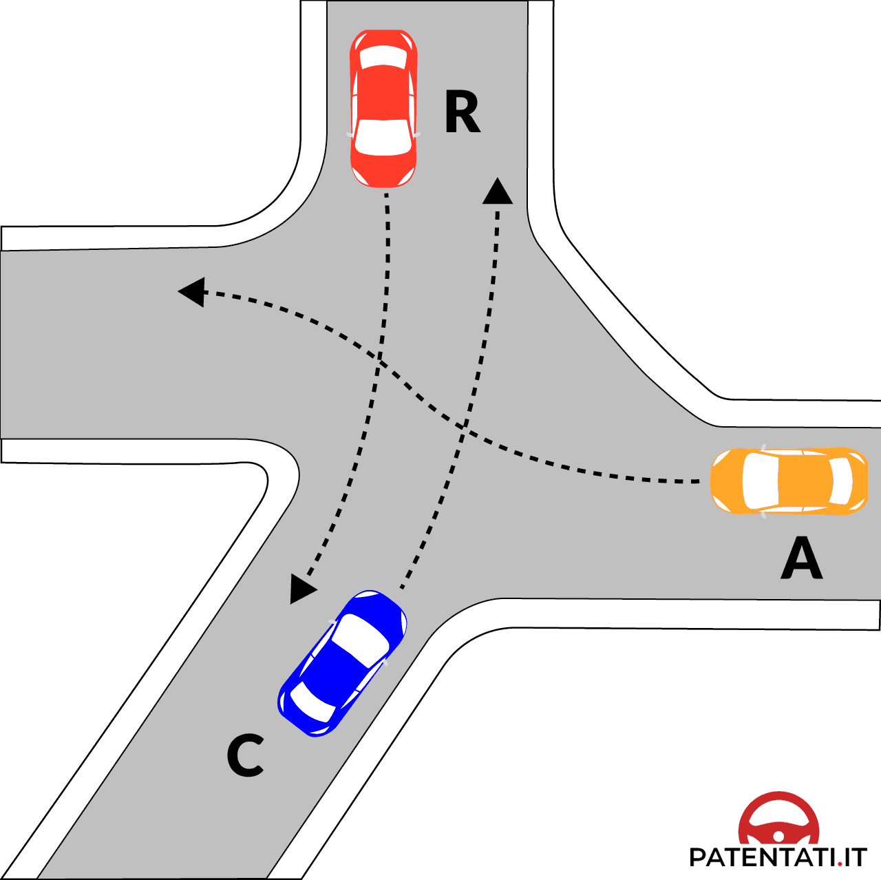 Secondo le norme di precedenza nell'incrocio rappresentato in figura il veicolo R passa per primo