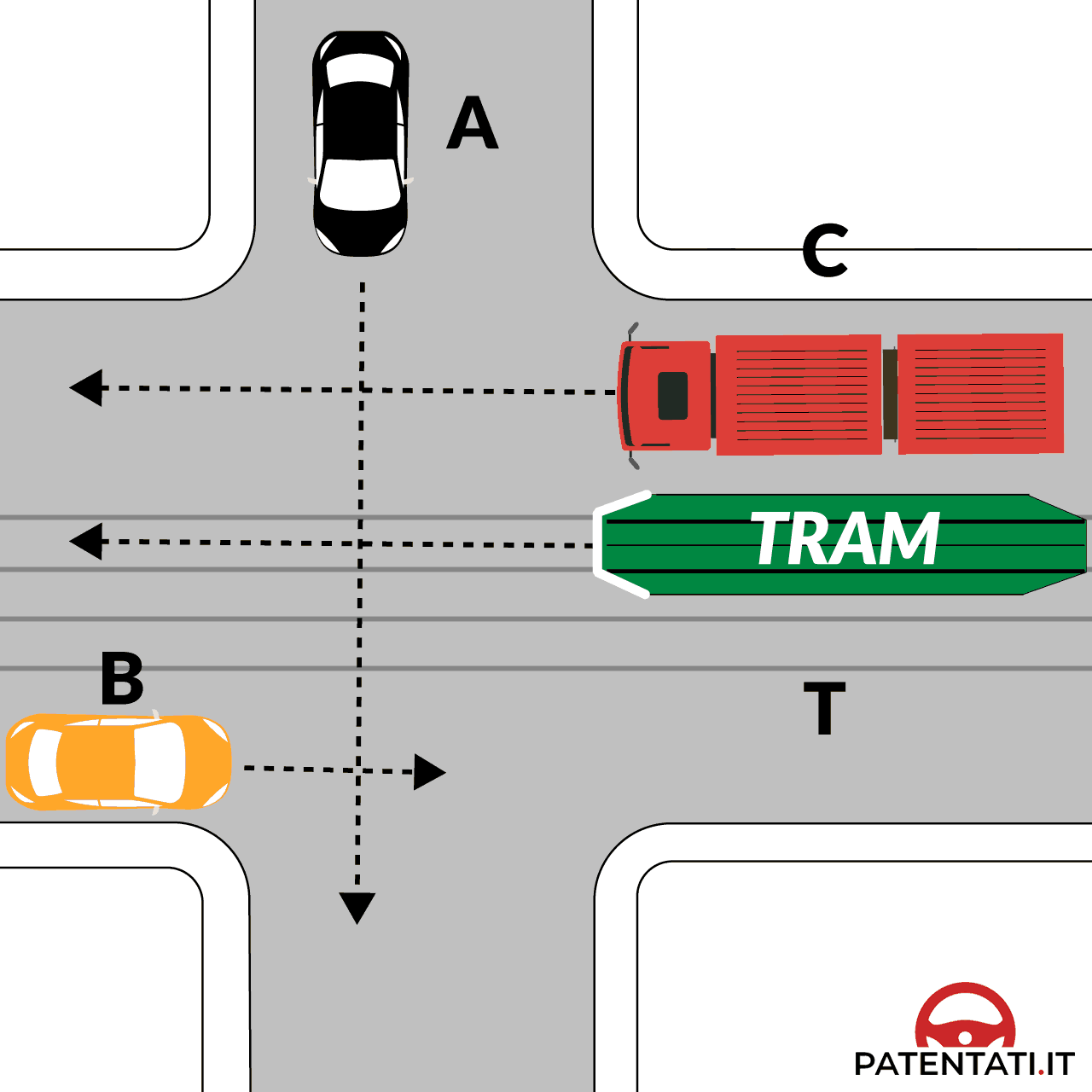 Nell'incrocio rappresentato nella figura il veicolo A deve dare la precedenza al tram e al veicolo B