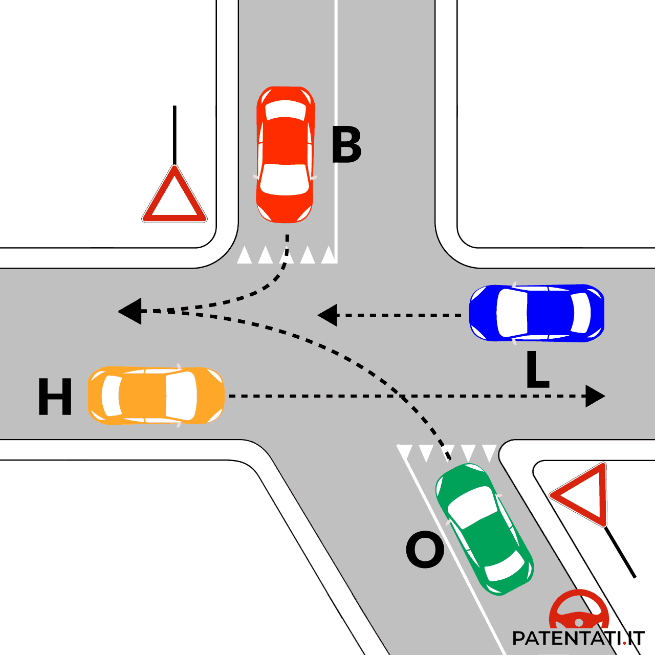 Secondo le norme di precedenza nell'incrocio rappresentato in figura i veicoli L e H passano contemporaneamente per primi