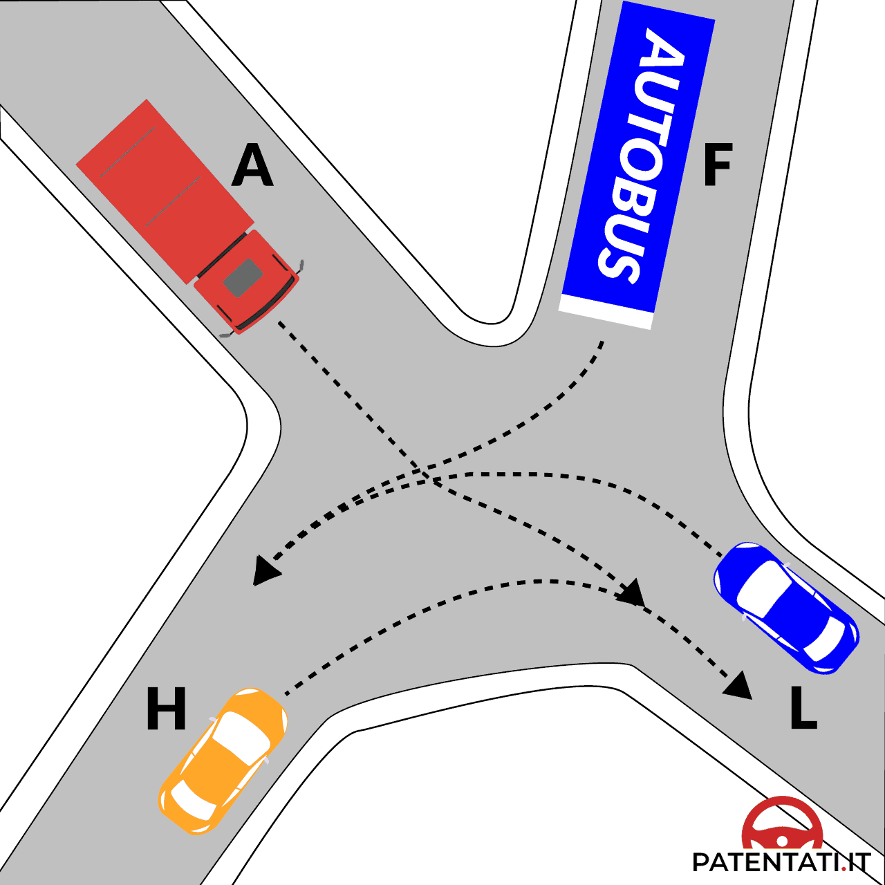 Secondo le norme di precedenza nell'incrocio in figura il veicolo F deve attendere il transito del veicolo A
