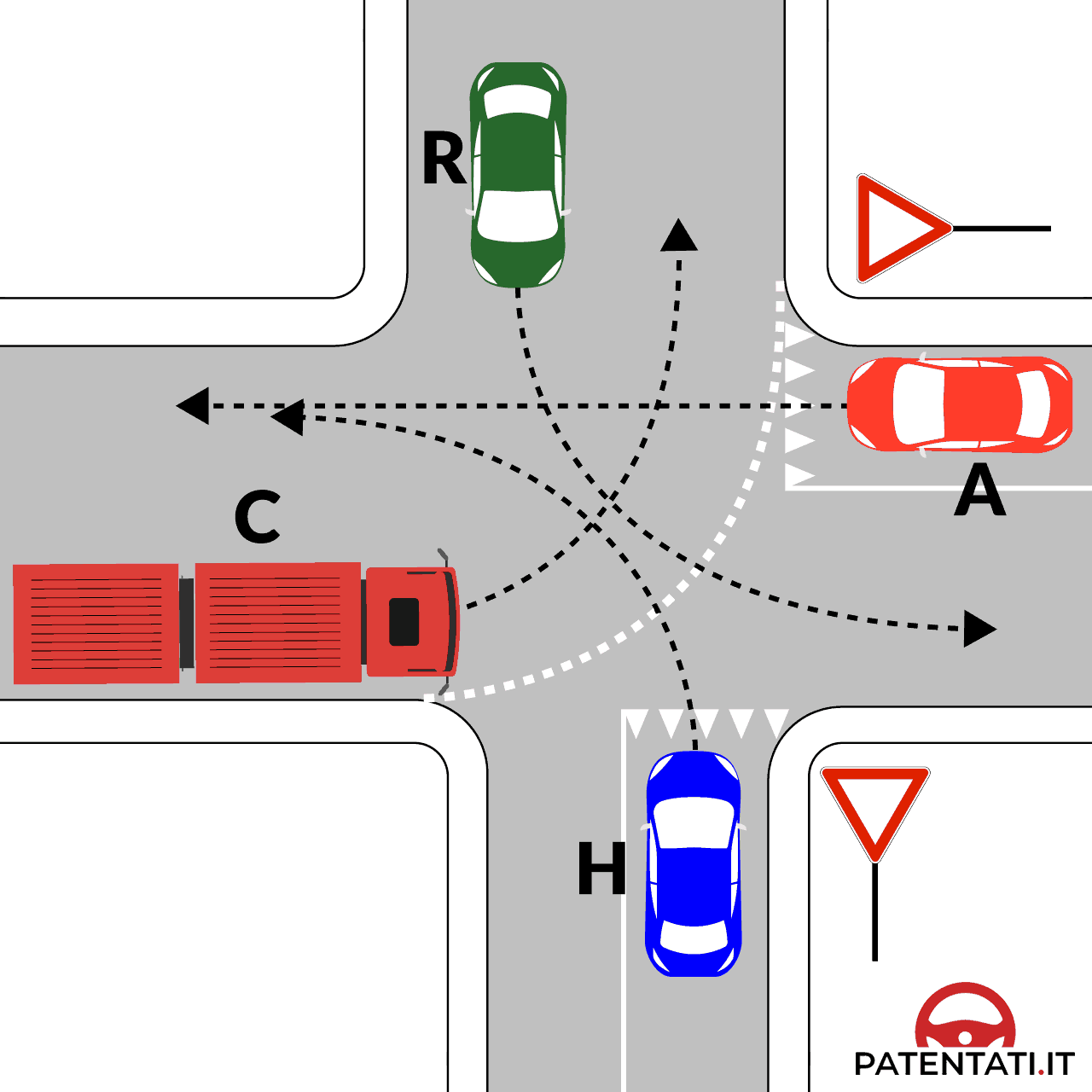 Nella situazione rappresentata in figura il veicolo A deve attendere il transito dei veicoli C ed R