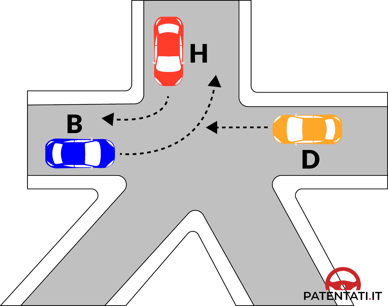 Nell'incrocio rappresentato in figura i veicoli disimpegnano l'incrocio nel seguente ordine: H, D, B