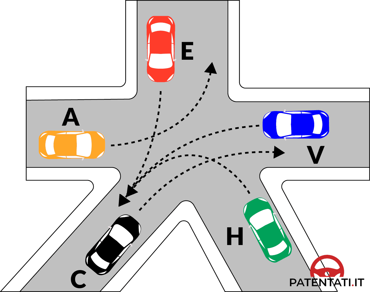 Nell'incrocio rappresentato in figura i veicoli disimpegnano l'incrocio nel seguente ordine: A, E, V, H, C